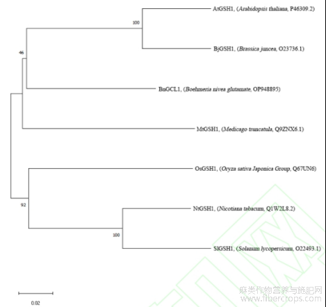 利用MEGA5软件的Neighbor-Joining法对BnGCL1以及GenBank数据库中其他植物的GCL蛋白构建系统进化树(图3)发现,苎麻BnGCL1蛋白与拟南芥(Arabidopsis thaliana,P46309.2)、芥菜(Brassica juncea,O23736.1)的亲缘关系最近,推测该类蛋白可能具有类似的功能。