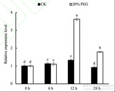 在20%PEG-200模拟的干旱胁迫下,研究BnGCL1基因在苎麻叶片中对干旱胁迫的响应,发现在干旱处理12h时苎麻叶片中BnGCL1基因的转录水平达到峰值,较干旱处理前(0h)提升3.62倍(图4)。表明BnGCL1基因能显著响应干旱胁迫,表达水平提高。