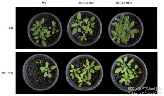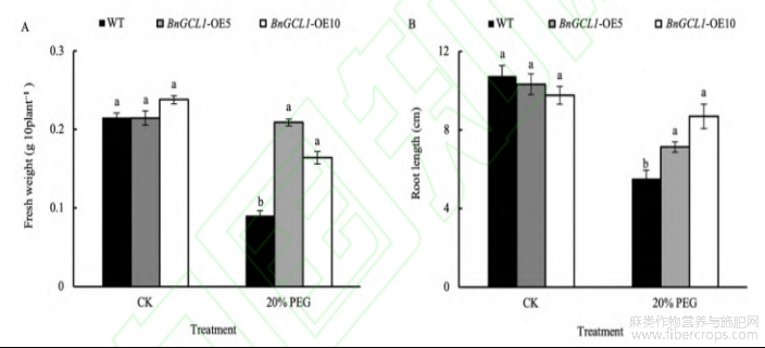 将T3代过表达BnGCL1的拟南芥与野生型拟南芥分别播种在1/2MS培养基上。2周后挑选高度一致且长势良好的拟南芥健康苗定植于珍珠岩盆栽中。培育10d后对拟南芥盆栽添加20%PEG-200,以未添加盆栽为对照,每个处理重复3次。处理7d后取整株洗净吸干多余水分,进行根长和鲜重的测量。测定步骤均重复3次。