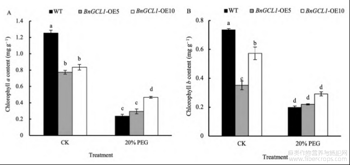 图7 干旱胁迫下过表达BnGCL1拟南芥叶绿素a与叶绿素b含量