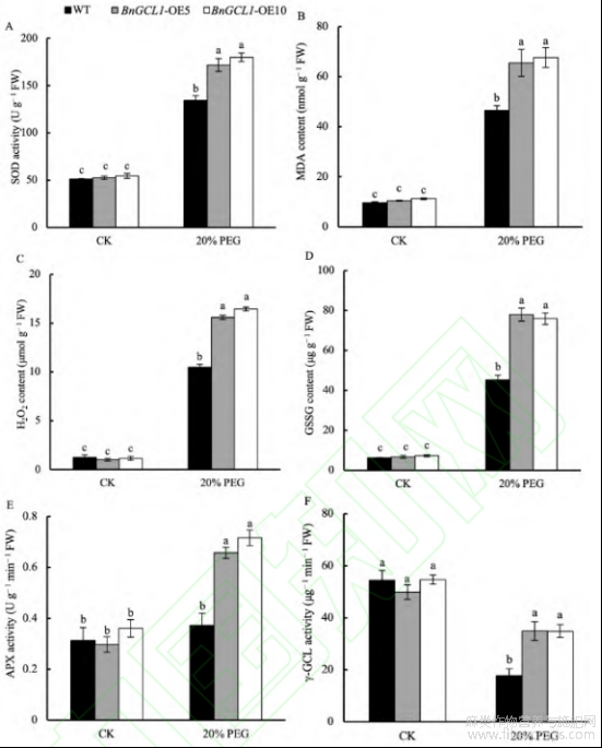在干旱胁迫下,与野生型相比,BnGCL1-OE5和BnGCL1-OE10的抗氧化酶活性显著提高,其中APX活性分别增加77.21%和93.01%,γ-GCL活性分别增加96.65%和96.49%,GSSG含量分别增加72.14%和67.59%。同时,SOD活性分别提高28.13%和34.08%,MDA含量分别增加40.71%和45.19%,H2O2含量分别增加48.50%和56.86%。这些结果表明,BnGCL1能增强抗氧化能力,提高植物应对干旱胁迫的能力(图8)。