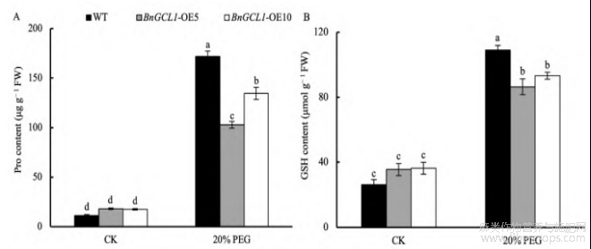 图9 干旱胁迫下过表达BnGCL1拟南芥脯氨酸(Pro)及谷胱甘肽(GSH)含量