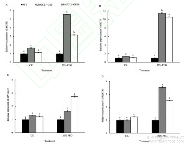 20%PEG-200干旱胁迫后BnGCL1-OE5和BnGCL1-OE10株系AtGST1表达量是野生型的5.55倍和3.17倍,AtGST11表达量是野生型的11.5倍和10.5倍,AtNCED3表达量分别是野生型的1.64倍和2.74倍,AtWRKY40表达量分别是野生型的3.56倍和2.52倍(图10)。表明过表达BnGCL1能显著提高干旱胁迫下拟南芥AtGST1、AtGST11、AtNCED3和AtWRKY40的转录水平。