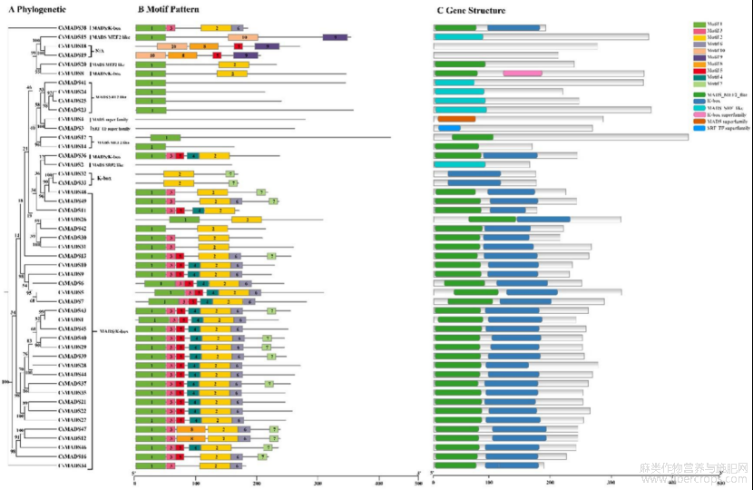 图1为巴马火麻MADS-box基因结构特征,其中A为MADS-box基因进化树;B为MADS-box基因motif基序特征;C为MADS-box基因保守结构域特征。