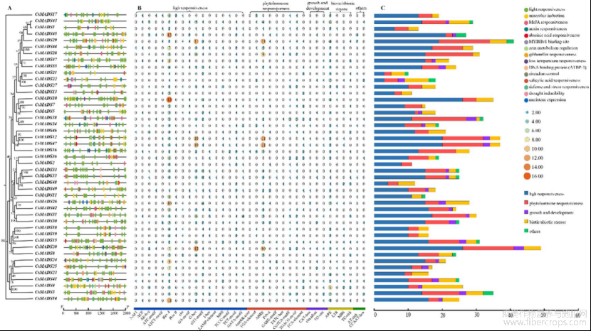 图2为巴马火麻MADS-box基因顺式元件特征,A为MADS-box基因上游-2000bp启动子顺式原件;B为启动子顺式原件的类别;C为启动子顺式原件的统计。