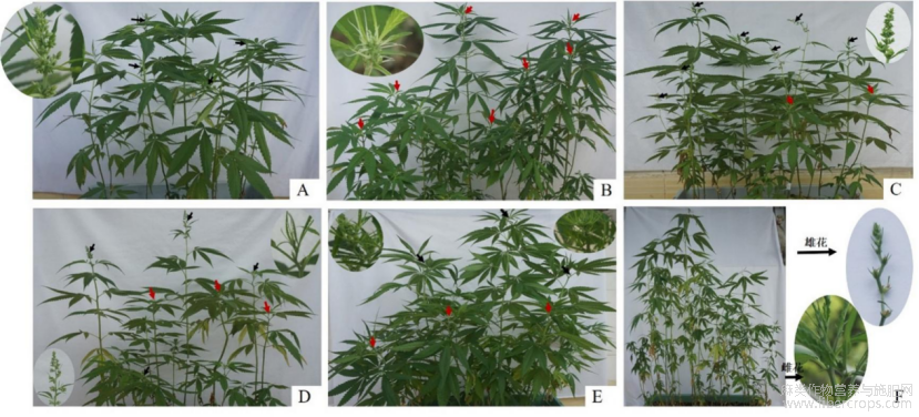 图3为不同植物激素处理巴马火麻的特性,A为对照;B为IAA处理后火麻植株特征;C为ABA处理后火麻植株特征;D为水杨酸处理后火麻植株特征;E为MeJA处理后火麻植株特征;F为GA3处理后火麻植株特征;其中红色箭头表示雌花花序,黑色箭头表示雄花花序。