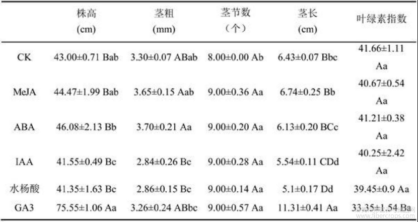 (1)除GA3处理能促进植株茎节生长外,其它激素处理对火麻植株株高生长无显著影响(表1);
