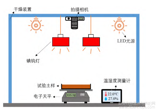 本文采用自制的干燥装置(图2)实时监测土体干燥过程的土体裂隙变化和水分损失,干燥装置主要由不锈钢支架、电子天平、2盏功率为500W的碘钨灯、相机、光源组成。