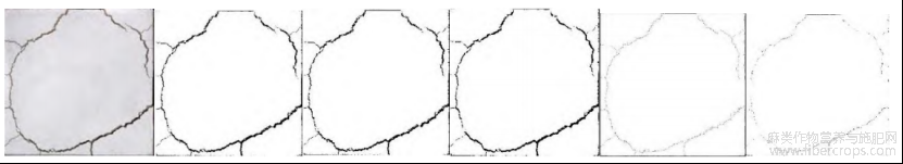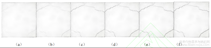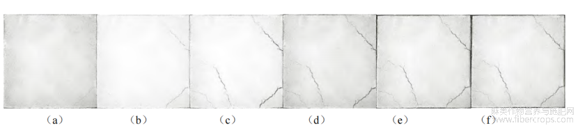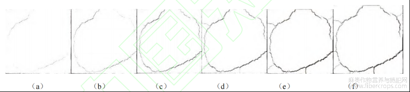 图6 剑麻纤维改良土的裂隙发育:(a)60min;(b)120min;(c)240min;(d)480min;(e)590min;(f)1440min
