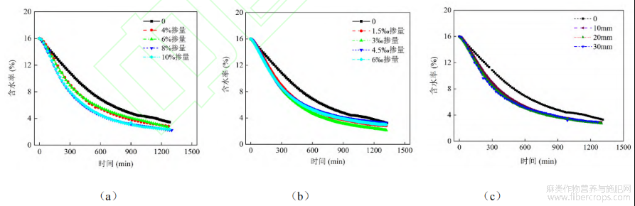 图8 土样含水率衰减曲线:(a)不同生物炭掺量;(b)不同剑麻纤维掺量;(c)不同剑麻纤维长度