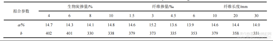 由表4可知,相关系数R2大于0.998,说明公式的拟合度很高。参数a范围为14%-15.2%,参数c范围为1.76%-3.1%,而土样的初始含水率设定为16%,说明试验操作存在一定误差。生物炭掺量、纤维掺量和纤维长度均影响参数b的大小,例如生物炭掺量从4%增加10%使衰减速率系数b降低16%,且生物炭掺量4%和6%时的b值均明显大于掺量8%和10%时的b值,说明生物炭掺量较多时,土样的水分蒸发速率也相应增大,这与生物炭的多孔性有关。另外,随着纤维掺量和长度的增加,参数b也呈减小的趋势,即说明土样的含水率衰减越快。参数c范围为1.76%-3.1%,这是土样含水率的衰减极值,说明在常温下土中的水分并不会随着干燥时间的延长而完全丧失,这些没有蒸发的水分可能是土的强结合水和弱结合水,需要更高温度环境才能蒸发。