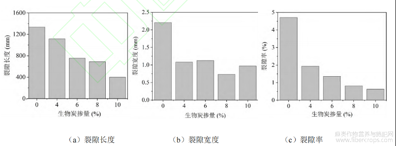 图9 生物炭掺量对裂隙的影响:(a)裂隙长度;(b)裂隙宽度;(c)裂隙率