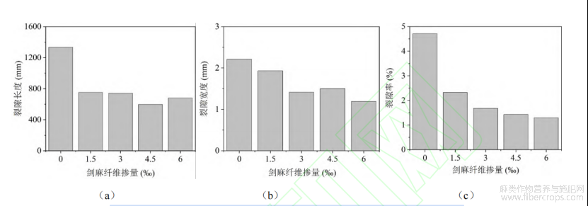 图10 纤维掺量对裂隙的影响:(a)裂隙长度;(b)裂隙宽度;(c)裂隙率