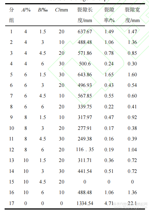 同理,可得到裂隙宽度的影响因素主次顺序为:纤维掺量>生物炭掺量>纤维长度。当水平组合为A、B、C时,即生物炭掺量为10%、纤维掺量为4.5‰、