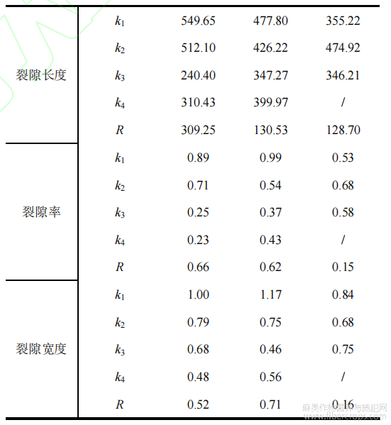正交试验可获得不同因素对试验指标的影响大小,不同生物炭掺量(A)、剑麻纤维掺量(B)和长度(C)的复合改良土裂隙特性指标如表5所示。对表5的正交试验结果进行极差分析,结果如表6所示,表中ki表示影响因素某水平的均值,最小的ki值对应的水平为最优水平;R为某种因素的ki的最大值与最小值之差,即极差,R值越大,则该因素对考核指标的影响越大,R值最大的因素即为主控因素。