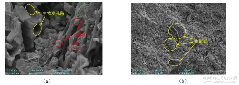 图11 生物炭改良土微观图像:(a)500倍;(b)5000倍