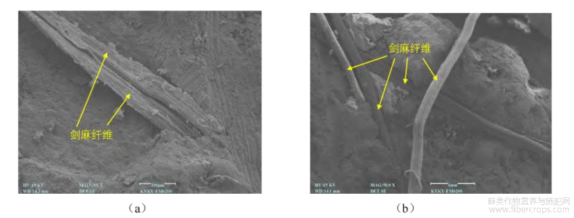 图12 剑麻纤维改良土微观图像:(a)50倍;(b)200倍
