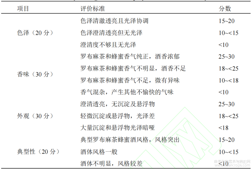 表2 罗布麻茶蜂蜜酒感官评分标准
