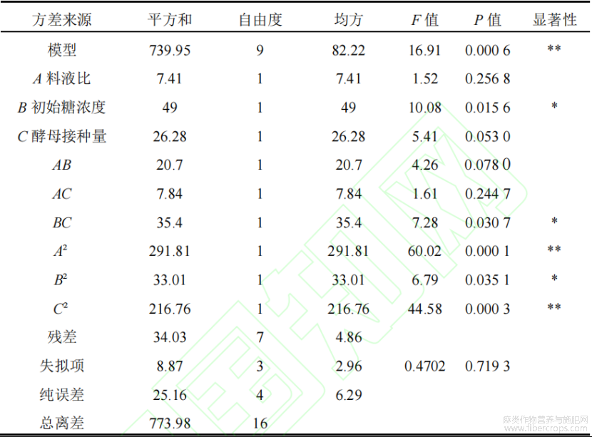 利用Design-Expert 13.0软件,将料液比、初始糖浓度、酵母接种量作为3个自变量,并以感官评分为响应值,对各因素回归拟合后,得出下列回归方程: