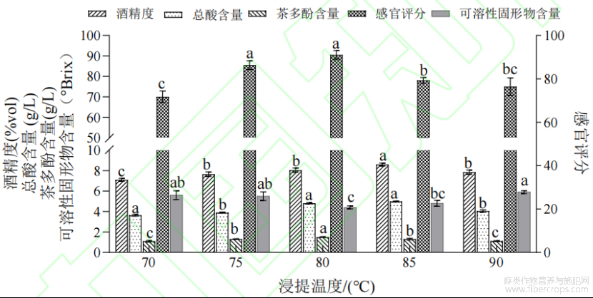 图3 浸提温度对罗布麻茶蜂蜜酒品质的影响
