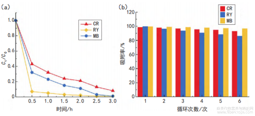 图6(a)显示了在Fe-PAPC气凝胶作用下三种染料(CR、MB和RY)的浓度随时间变化情况。随着吸附时间延长,三种染料的浓度均迅速下降。在0.5h时,CR和MB的浓度降至初始浓度的约40%,而RY浓度显著降至10%。三种染料的浓度下降速率表现为RY>MB>CR,表明Fe-PAPC对活性染料(RY)具有最优的吸附性能。至3h时,三种染料浓度均降至初始值的10%以下,此时Fe-PAPC对CR、MB和RY的吸附率分别达到98%、99%和99%。