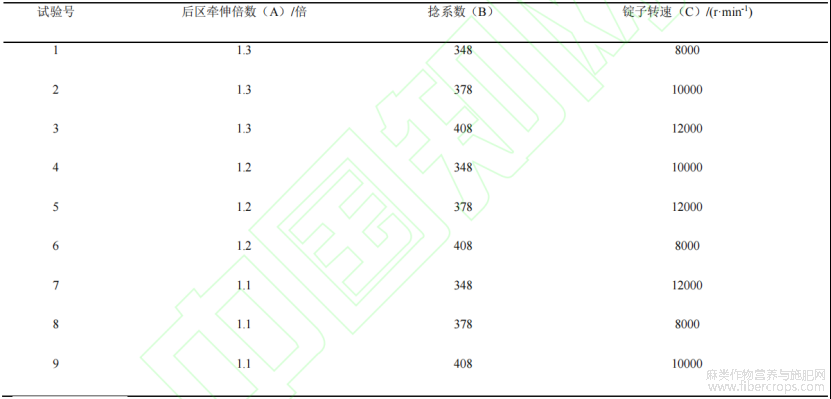 实验选取生物基PA56/罗布麻(80/20),设定细纱线密度为20.8tex,采用传统的环锭纺制纱线。选取后区牵伸倍数(A)、捻系数(B)和锭子转速(C)作为影响纱线性能的3个主要因素,每个因素设定3个水平。其中A因素的后区牵伸倍数分别设为1.3、1.2和1.1倍;B因素的捻系数分别设为348、378和408;C因素的锭子转速分别设为8000、10000r/min和12000r/min。正交试验方案设计如表2所示,