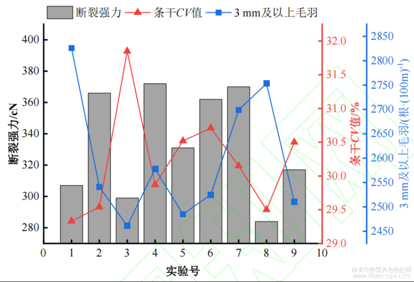 对正交试验纺制的9种混纺纱线进行断裂强力、毛羽数和条干CV值进行测试,采用极差法分析实验数据,通过计算各因素水平下指标的总和与极差,量化评估了不同工艺因素对纱线性能的影响程度,据此筛选出最优工艺组合。在评价体系中,断裂强力与纱线性能呈正相关,而条干CV值和3mm及以上毛羽数则与性能呈负相关。纱线性能测试结果如图1所示。