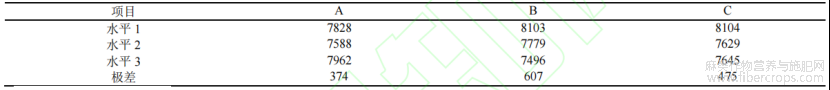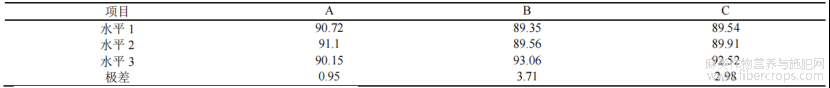在灰色聚类分析中,σik表明在该灰度区间的概率大小,根据概率数值大小可以分析比较9种方案的优劣。比如上述实验8在三种灰度区间中,其中差灰度区间的系数最高,表明主要集中在差类灰度区间,概率为0.6737。因此可以分析得出:实验3、实验4和实验9处于优灰度区间,实验5处于中等灰度区间;实验1、实验2、实验6、实验7和实验8处于差灰度区间。在优灰度区间中,实验4出现的概率最大,为0.3475,表明在该工艺参数设置下纱线综合性能表现良好。最佳纺纱工艺参数为:捻系数348,锭速10000r/min,后区牵伸倍数1.2倍。