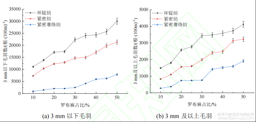 如图3所示,在罗布麻/生物基PA56混纺纱中,随着罗布麻纤维比例的增加,三种纺纱方式下纱线的毛羽数量均呈现上升趋势。该现象主要归因于罗布麻纤维本身的特性:其长度较短、整齐度差,短纤维占比较高,在纺纱过程中易从纱体中被抽出而形成毛羽;同时,罗布麻纤维表面光滑、缺乏天然转曲,导致纤维间抱合力不足,进一步加剧了纤维滑移与毛羽的产生。从纺纱方式的影响来看,环锭纺因加捻三角区较大,纤维在加捻时易发生滑移和松散,故毛羽数量较多。紧密纺通过优化纤维须条结构,在加捻前使纤维更为平行、紧密排列,有效减小了加捻三角区,从而显著抑制毛羽的产生。紧密赛络纺在紧密纺的基础上引入双股结构,进一步增强了纤维间的紧密性,减少了纤维滑移与抽出现象,因而表现出最优的毛羽控制效果。