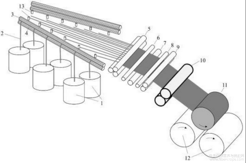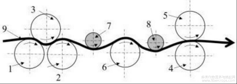 图2中:1为后罗拉1,2为后罗拉2,3为后皮辊,4为前罗拉,5为前皮辊,6为中罗拉,7为后压辊,8为前压辊,9为麻条。