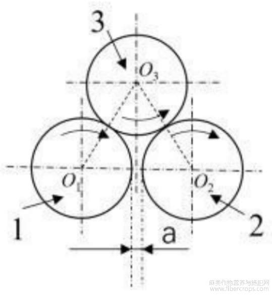作为本发明所述一种苎麻、亚麻短麻纤维精梳前准备工序的工艺方法的一种优选方案,其中:后罗拉对的两个罗拉与皮辊呈品字型结构,两个罗拉轴心O1和O2水平对齐,两罗拉表面的最小距离a为5?10mm;皮辊轴心O3与两罗拉轴心O1和O2呈等腰三角形,两罗拉轴心的连线为该等腰三角形的底边。