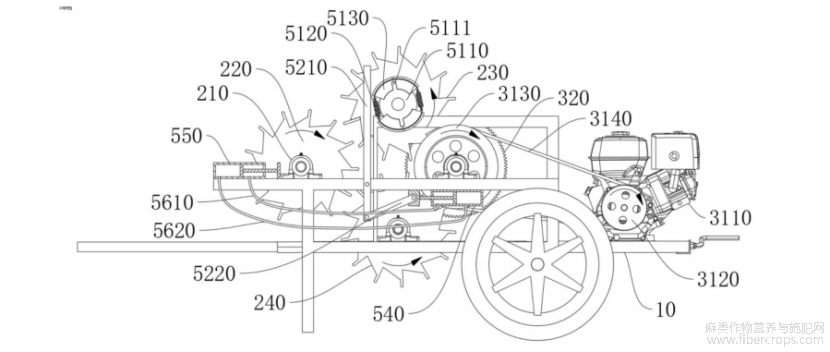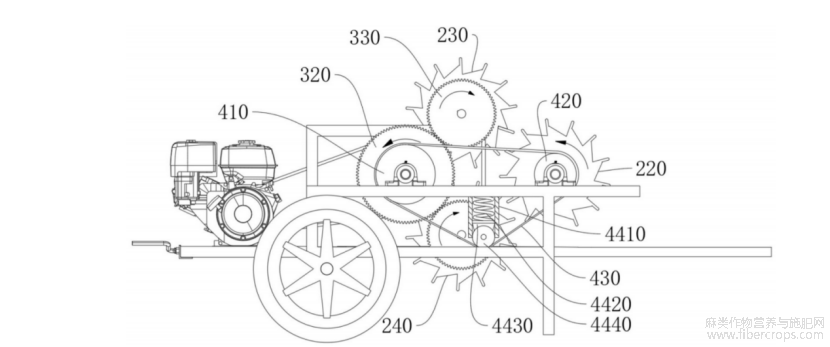 第二剥皮辊230和第三剥皮辊240的转向相同,若韧皮部进入第二剥皮辊230与第三剥皮辊240之间的空隙,韧皮部会被第三剥皮辊240刮出并进入第一剥皮辊220与第三剥皮辊240之间。