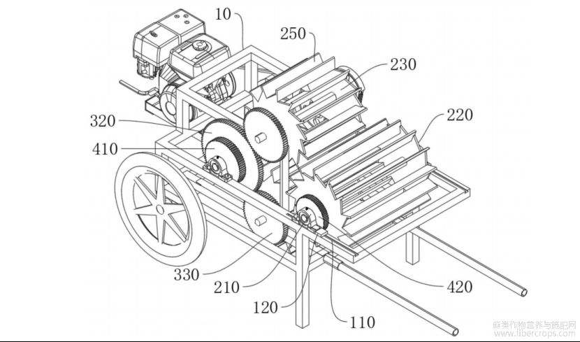 第一剥皮辊220、第二剥皮辊230和第三剥皮辊240均周向设有多个打板250,第一剥皮辊220、第二剥皮辊230和第三剥皮辊240的打板250交错布置,第一剥皮辊220、第二剥皮辊230和第三剥皮辊240的内部中空,以便敲击苎麻后,苎麻的木质部和麻壳能从打板250之间的空隙掉落。