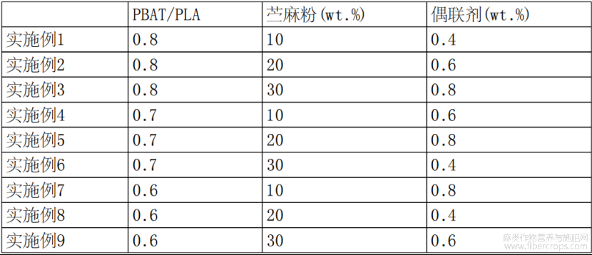 实施例2-9提供一种全生物降解的苎麻改性材料的制备方法,其制备步骤与实施例1的区别为:PBAT和PLA的质量比不同,苎麻粉和偶联剂的添加量不同,实施例2-9的PBAT和PLA的质量比、苎麻粉和偶联剂的添加量如表1所示;