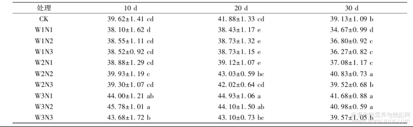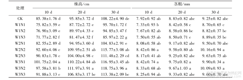 当施氮水平一定时,株高和茎粗随着灌溉量增加而增加。就株高而言,处理后20d,N1水平下,W3分别较W1、W2显著提高25.65%、16.08%;N2水平下,W3较W1、W2分别提高24.45%、1.84%;N3水平下,W3较W1、W2分别提高31.13%、2.72%。就茎粗而言,处理后20d,N1水平下,W3较W1、W2分别增加15.80%、6.32%,在N2水平下分别提升12.70%、0.94%,在N3水平下分别提高9.76%、0.86%。从整个试验阶段来看,W3N1和W2N2的茎粗分别较W1N1显著增加13.79%~15.80%和13.78%~16.78%(P<0.05);W2N2的株高和茎粗分别较CK提高了6.98%~14.71%和6.31%~9.84%。可见,过度的水分胁迫和过量施氮会阻碍苎麻的生长,合理的水氮配比不但能促进苎麻生长,还有利于节水节肥。