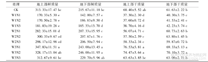 如表2所示,在W1和W2组合处理下,地上部、地下部鲜质量及地上部、地下部干质量与CK相比呈下降趋势,说明干旱会抑制苎麻生物量积累,阻碍作物正常生长。然而增施氮素可以提高水分调亏下苎麻的生物量,但不同水分处理下,增施氮素处理的表现不一致。在W1水平下,地上部鲜质量和地上部、地下部干质量均随施氮量增加而逐渐增加;在W2水平下,随施氮量的增加,地上部、地下部鲜质量和地下部干质量呈先增加后降低的趋势,且在N2条件下生物量最大。W2N2处理的地上部鲜质量分别较W1N1、W1N2、W1N3、W2N1、W2N3处理提高了76.32%、76.15%、65.17%、6.38%、0.72%,W2N2的地下部鲜质量、地上部干质量和地下部干质量分别较W1N1处理显著提高了46.25%、54.16%和58.31%(P<0.05);在W3水平下,地上部鲜质量和干质量随施氮量增加呈逐渐下降的趋势,地下部鲜质量和干质量呈先增后降的趋势。综上说明,在本试验条件下,适量的灌溉和适量增施氮素能较好的缓解干旱和低氮对苎麻生物量的影响。