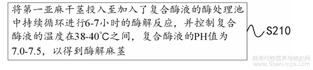 步骤S210,将第一亚麻干茎投入至加入了复合酶液的酶处理池中持续循环进行6-7小时的酶解反应,并控制复合酶液的温度在38?40℃之间,复合酶液的PH值为7.0?7.5,以得到酶解麻茎。