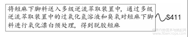 步骤S411,将短麻下脚料送入多级逆流萃取装置中,通过多级逆流萃取装置中的过氧化氢溶液和臭氧对短麻下脚料进行氧化漂白预处理,得到脱胶短麻。