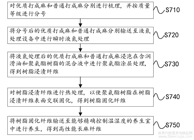 步骤S700,对优质打成麻和普通打成麻分别依次进行手工梳理、分号、液氮改性、聚氨酯涂层处理、加热固化及智能控制养生处理,得到高性能长麻纤维。