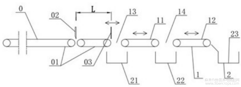当最后一段的红麻茎秆长度不足第一落料间隙13的一半时,要么其在传送带01输出端输出时就会因倾斜而从第一落料间隙13处下落,或者其输送到了第一筛选输送带11上,也会因为重心未移动到第一筛选输送带11上而从第一落料间隙13处掉落,进而这部分长度尺寸偏短的红麻茎秆就被第一收集腔21所收集待之后再利用。