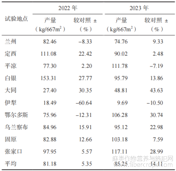 2020-2021年陇亚31号在水地(武威)和旱地(榆中)同时进行品种比较试验,结果表明,该品种适应性较好,抗旱性较强,丰产性及综合性状优良,对白粉病表现为高抗—免疫,在旱地每667m2产量为91.90kg,较对照陇亚10号增产8.72%;水地产量为170.55kg,较对照陇亚10号增产25.55%。2022-2023年推荐参加全国胡麻品种抗旱筛选试验(表1),2022年10点次试验,在甘肃定西、甘肃平凉、甘肃白银、山西大同、内蒙古乌兰察布、宁夏固原、河北张家口7个点增产,每667m2平均产量81.18kg,较对照陇亚13号(77.06kg)增产5.35%,居参试材料第4位;2023年10点次试验,在甘肃兰州、甘肃定西、甘肃白银、山西大同、内蒙古鄂尔多斯、内蒙古乌兰察布、宁夏固原、河北张家口8个点增产,平均产量为85.25kg,较对照陇亚13号(74.71kg)增产14.11%,居参试材料第3位。2年每667m2平均产量为83.22kg,较对照陇亚13号增产9.66%,在11个参试材料中居第3位。