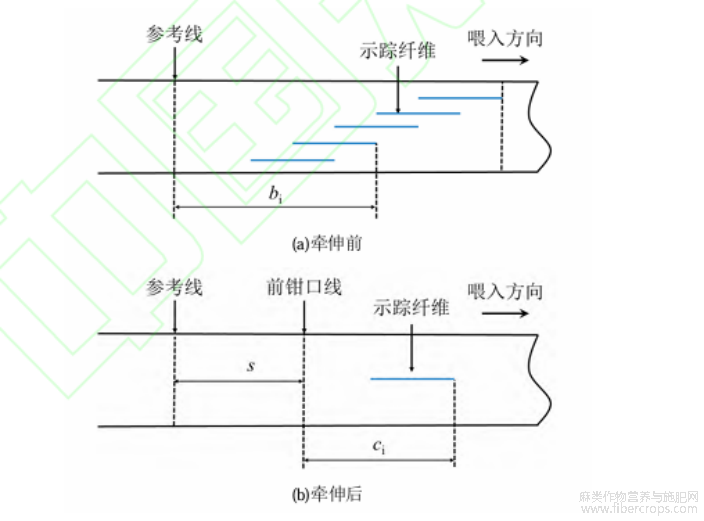 a)样品制备:取适量实验用苎麻条,将其平整铺展于水平桌面上,避免出现褶皱或拉伸变形。在苎麻条尾端(后进入牵伸区的一端)用标记笔绘制一条清晰的参考线,作为后续长度测量基准;选取长度分别为40、70、100mm的示踪纤维(选用与苎麻纤维颜色差异明显的纤维,便于观察识别),按图2(a)所示排列方式埋入苎麻条中,并准确测量记录牵伸前示踪纤维头端(先进入牵伸区的一端)到参考线的距离,记为bi。