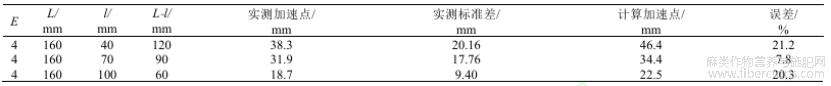 为验证加速点计算模型的有效性,本文通过示踪纤维法,在设定实验条件(牵伸倍数E=4,隔距L=160mm)下,对长度分别为40、70、100mm的苎麻纤维进行加速点实测,并将实测结果与理论模型计算结果进行对比分析,具体结果如表1所示。