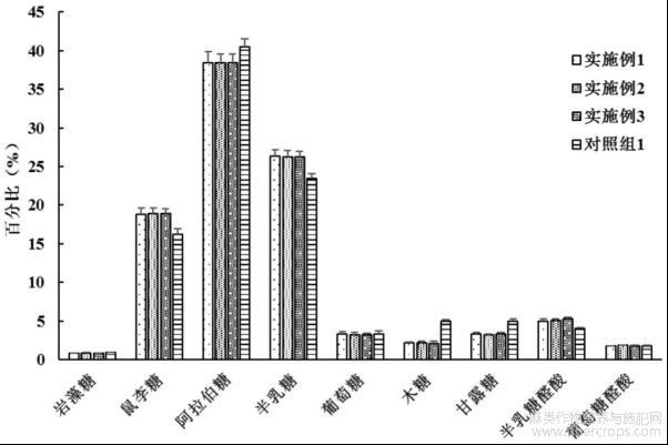 图2为本发明实施例1-3和对照组1所制备的红麻果胶的单糖组成。