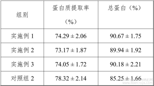 实施例1至3、对照组2的蛋白质提取率及总蛋白含量测定结果见表2。
