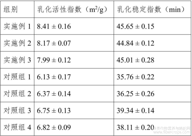 实施例1至3、对照组1至2的红麻果胶-藜麦蛋白混合溶液,对照3柑橘果胶-藜麦蛋白混合溶液,以及对照组4苹果果胶-藜麦蛋白的乳化活性指数和乳化稳定指数测定结果见表3。