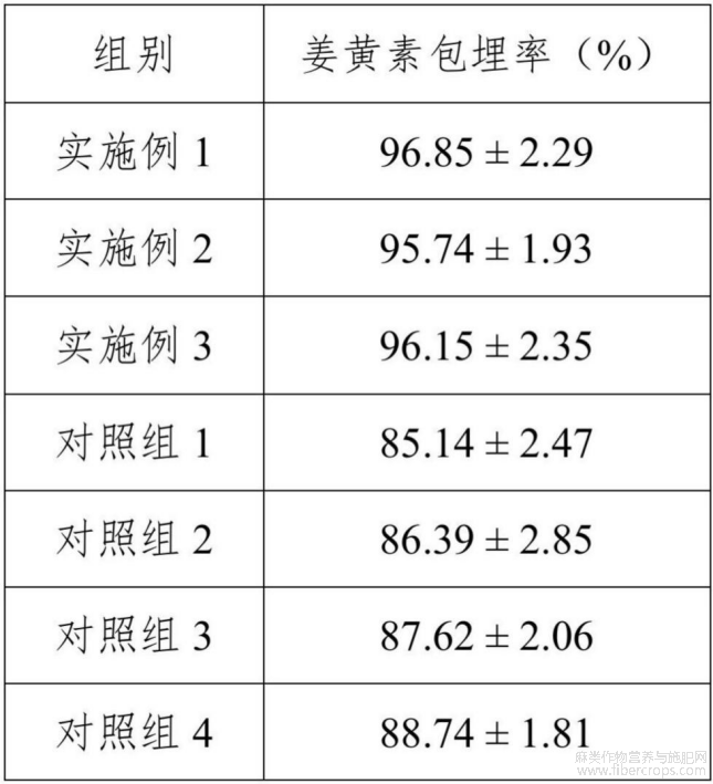 实施例1至3、对照组1至4的姜黄素包埋率测定结果见表4。
