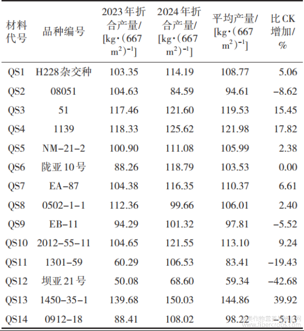 表1 2023年—2024年全国胡麻品种区域试验产量汇总表