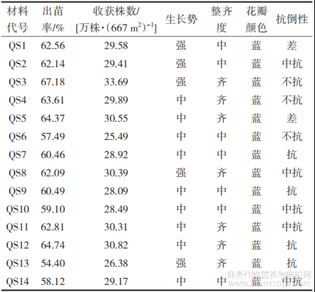各参试品种出苗率在54.40%~67.18%,收获株数在25.49×104~33.69×104株/667m2。所有品种除H228杂交种、08051、51、0502-1-1的长势强外,其余均为中等。有6个品种生长整齐,其余均为中等。EA-87、EB-11等3个胡麻品种抗倒伏,其余为中等抗倒伏以下。参试品种的花色均为蓝色,具体情况见表5。