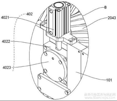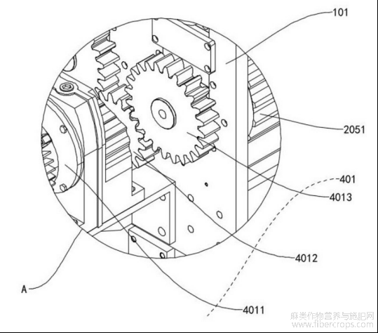 需要说明的是,使用时,电机4011启动后,通过主动齿轮4012与从动齿轮4013的啮合传动,带动各主动辊同步旋转,主动辊再与对应的从动辊啮合,实现物料的夹持输送与碎茎,而驱动机构二402可根据亚麻杆茎的粗细、含水率等工况,通过电动伸缩杆4021的伸缩动作,调节各从动辊的高度,进而改变辊间间距与夹持压力,例如,针对粗、含水率高的茎秆,电动伸缩杆4021收缩,带动从动辊上升,增大辊间间距、降低压力,反之,针对细、含水率低的茎秆,电动伸缩杆4021伸长,带动从动辊下降,减小辊间间距、提升压力,确保碎茎效果与纤维质量。